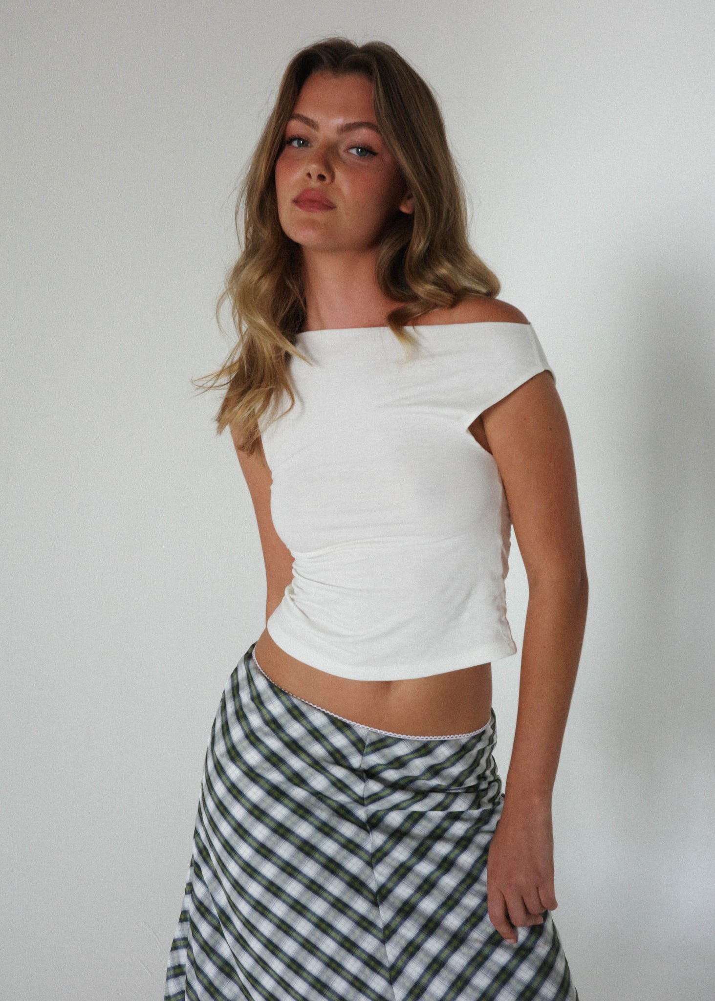 Off-shoulder cotton top featuring side ruching and a soft, slightly sheer finish.