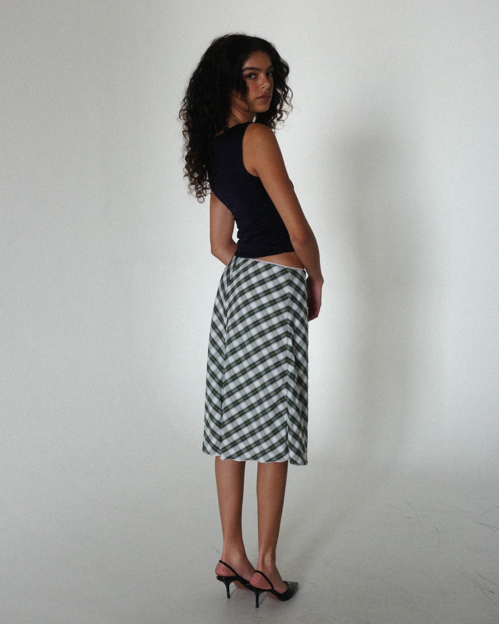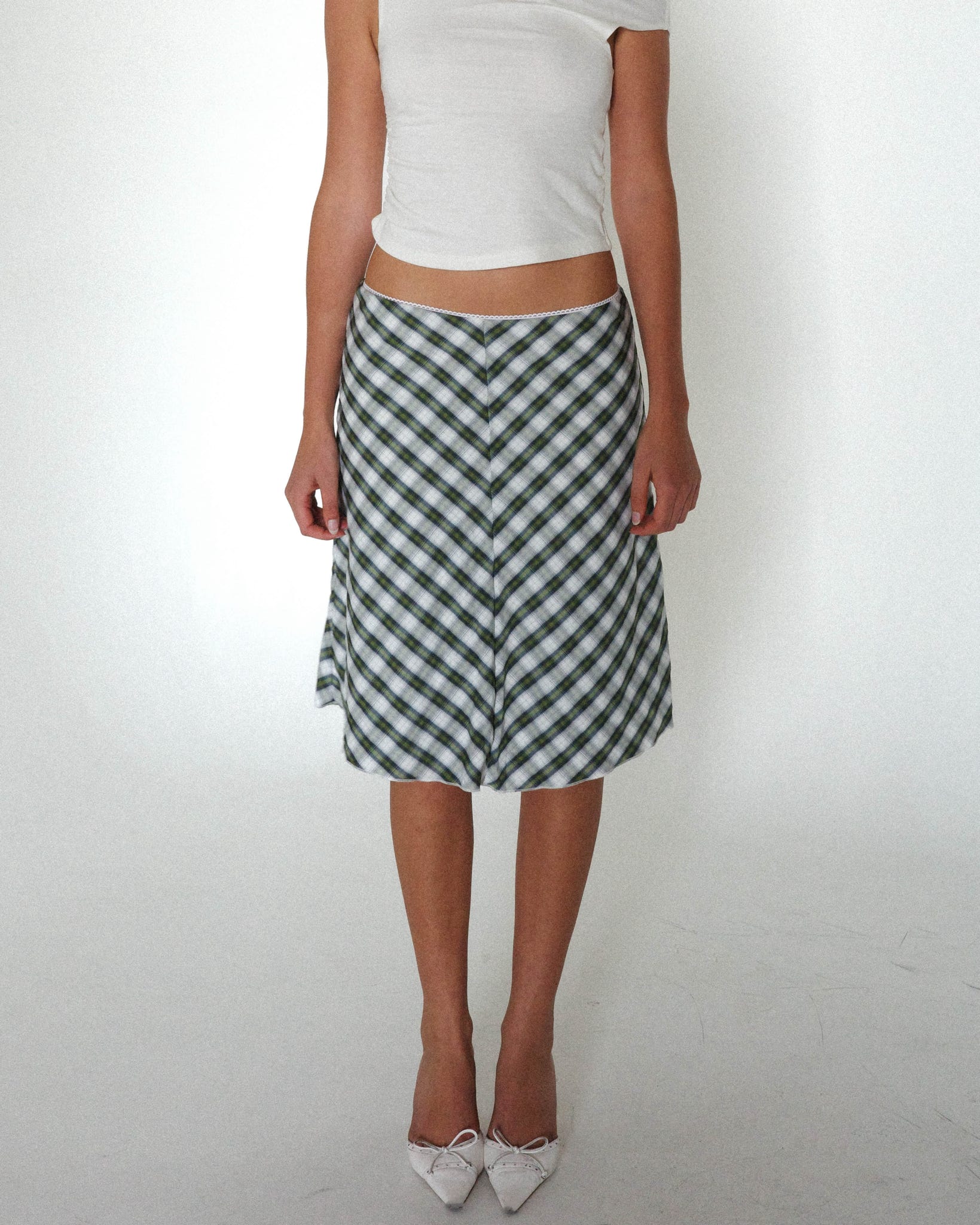 Low-waisted plaid skirt featuring a soft cotton-poly blend with a smooth rayon lining and an easy, flowy drape.